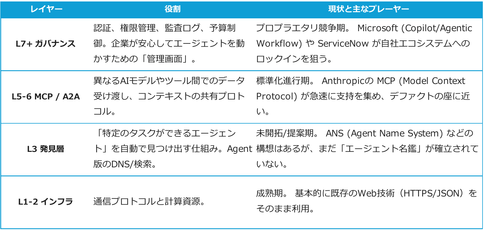 | MCP | Anthropic(2024年11月) | エージェント ↔ ツール | デファクト化 |